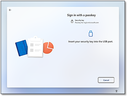 Note: If you are asked to insert a Security Key and prefer to use your passkey on your mobile device, select Cancel. Next, choose Sign in another way, then Face, fingerprint, then PIN or security key, and Sign in with your passkey. Finally, on Choose a passkey screen select iPhone, iPad, or Android device and follow the instructions to complete authentication.